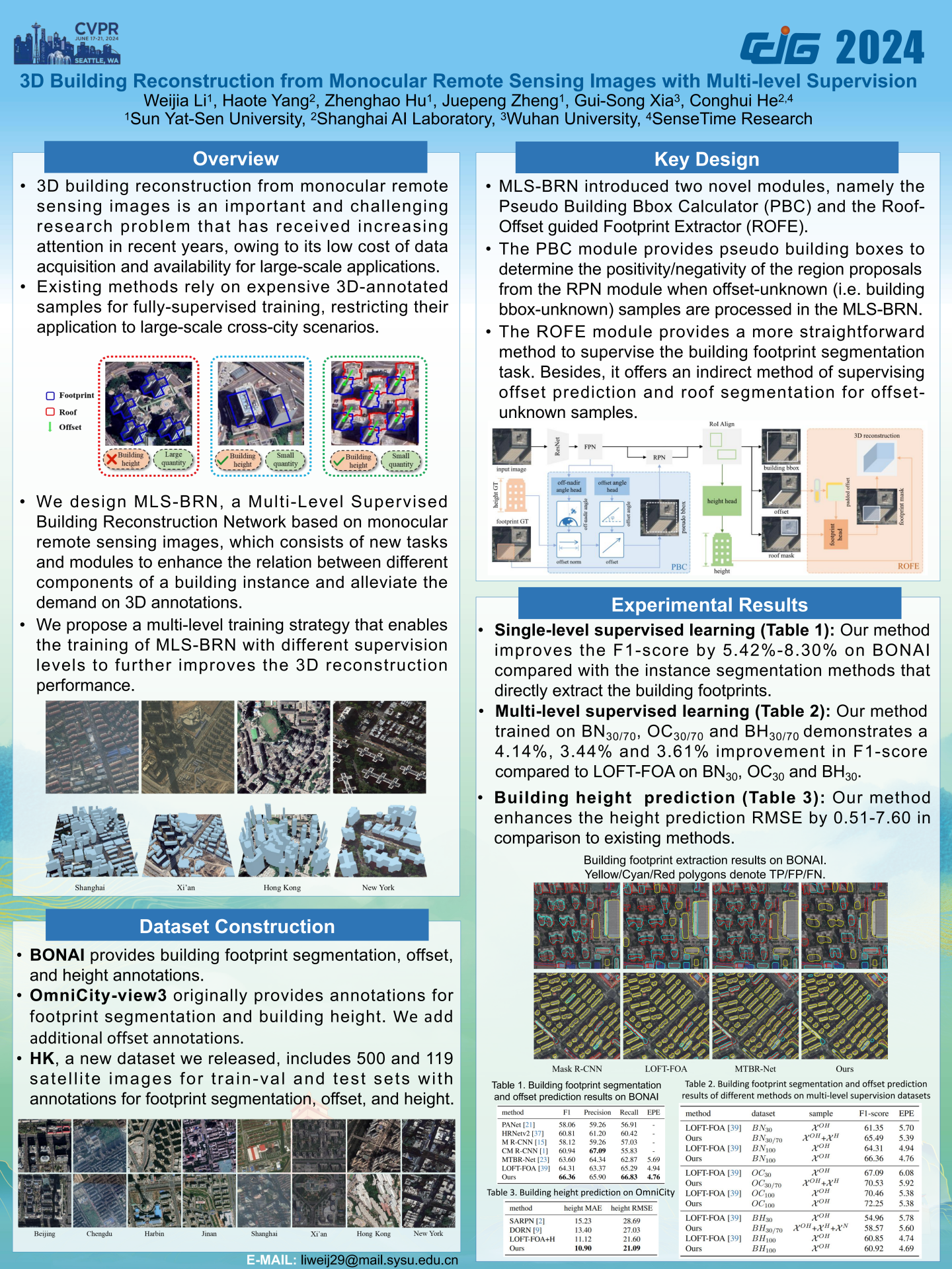| P086 | 3D Building Reconstruction from Monocular Remote Sensing Images with Multi-level Supervision | 李唯嘉、杨浩特、胡郑浩、郑珏鹏、夏桂松、何聪辉 | CVPR | 查看 |