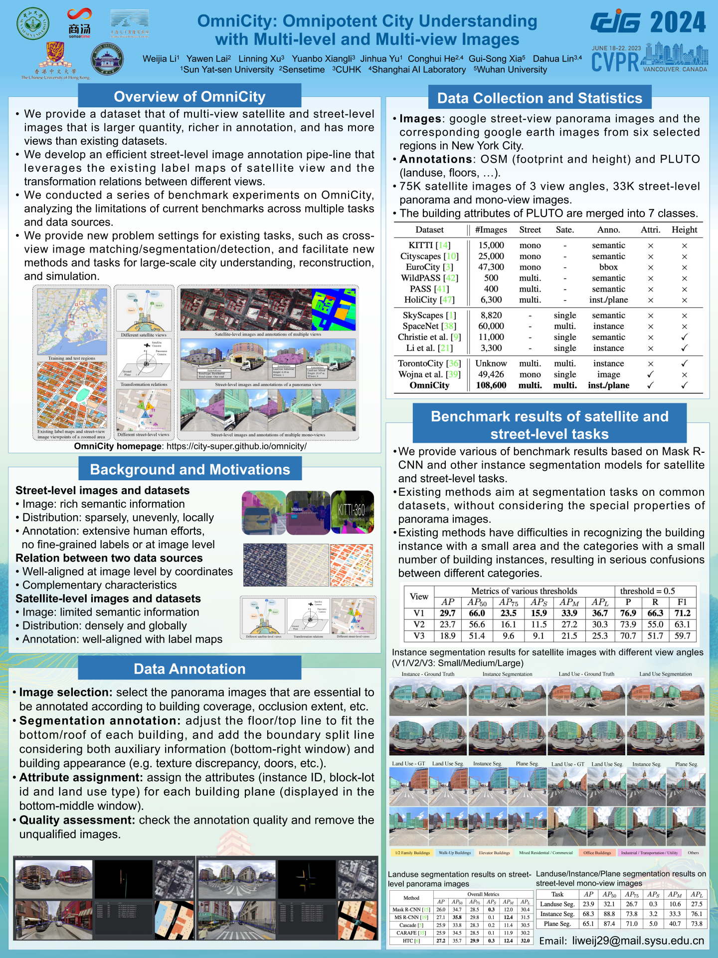 | P087 | OmniCity: Omnipotent City Understanding with Multi-level and Multi-view Images | 李唯嘉、赖亚文、徐霖宁、相里元博、于锦华、何聪辉、夏桂松、林达华 | CVPR | 查看 |