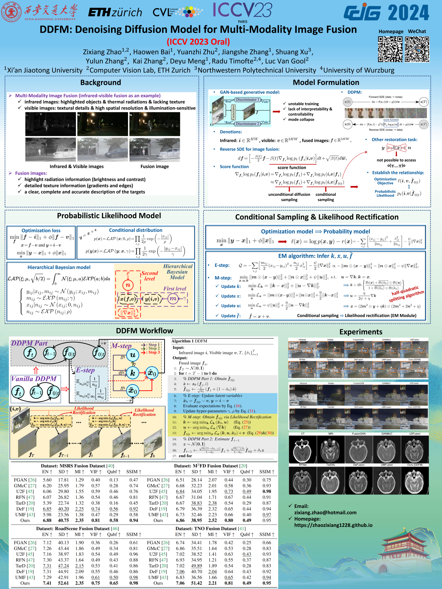 | P093 | DDFM: Denoising Diffusion Model for Multi-Modality Image Fusion | 赵子祥、白浩闻、朱元治、张讲社、徐爽、张宇伦、张凯、孟德宇、Radu Timofte、Luc Van Gool | ICCV | 查看 |