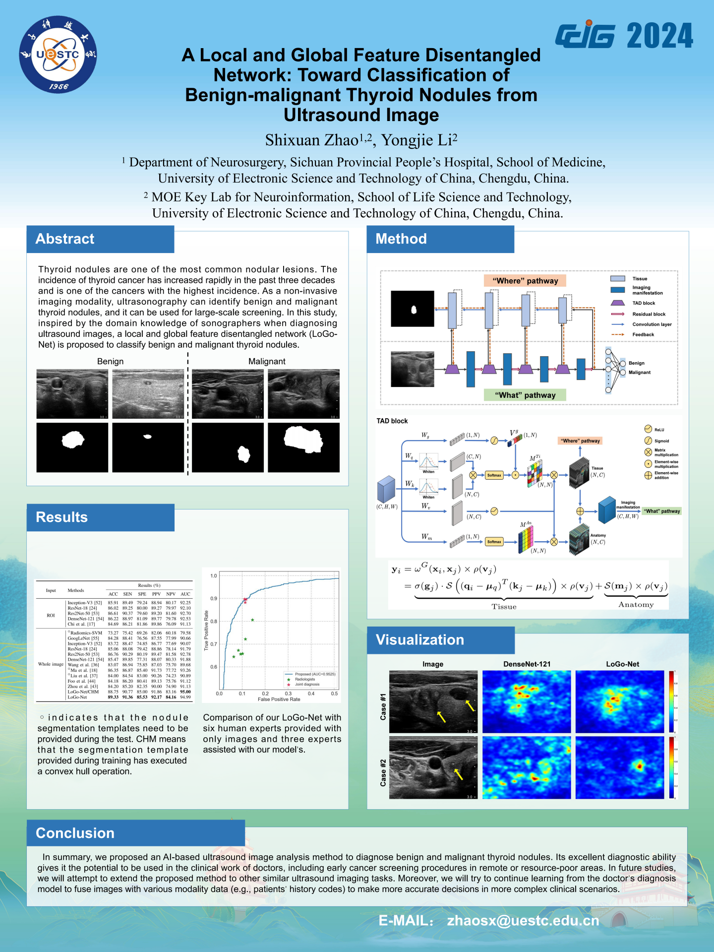 | P096 | A Local and Global Feature Disentangled Network: Toward Classification of Benign-malignant Thyroid Nodules from Ultrasound Image | 赵世轩、陈杨、杨开富、罗燕、马步云、李永杰 | IEEE TMI | 查看 |