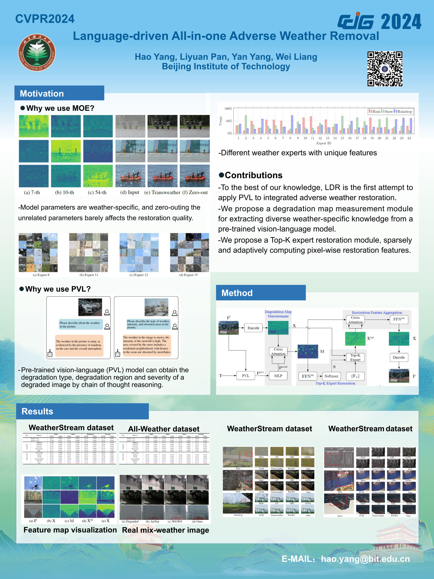 | P097 | Language-driven All-in-one Adverse Weather Removal | 杨浩、潘利源、杨焱、梁玮 | CVPR | 查看 |